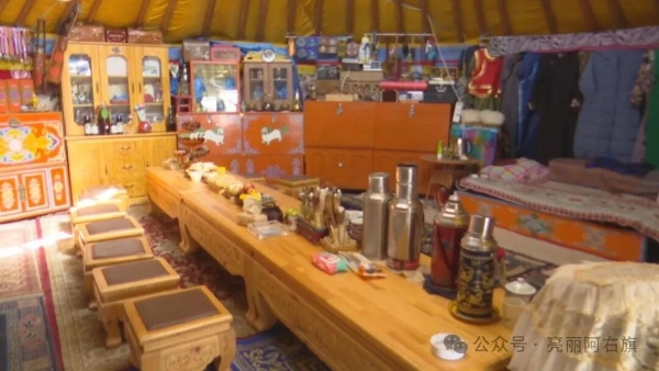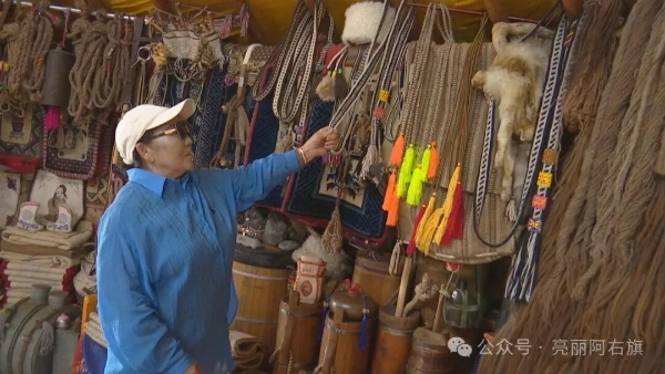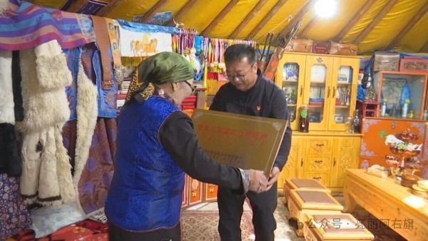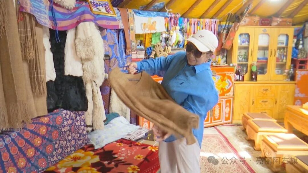 在琪琪格老人家,阿拉腾朝格苏木负责人为她送去“2025年自治区农村牧区文化示范户”牌匾,为老人“老物件与驼产业文化展示馆”增添手工编织驼绳、驼绒围巾等物件。