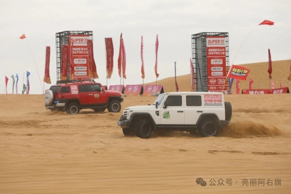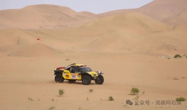 在巴丹吉林沙漠英雄会场,赛旗迎风招展,引擎声浪阵阵,参赛车手们做赛前准备。裁判员、志愿者、媒体记者等赛事相关人员在发车点翘首以盼,沙漠赛道特有的肃杀感扑面而来。
